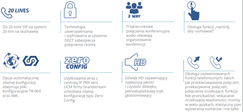 Stacja DP755 obsługuje wiele różnych metod automatycznej konfiguracji zdalnej, zapewniając bezpieczne szyfrowanie TLS/SRTP/HTTPS. W przypadku połączenia ze słuchawkami DP720, DP722 lub DP730 firmy Grandstream model DP755 staje się wysokiej klasy stacją bazową działającą w systemie DECT przeznaczoną dla wszystkich firm, lub użytkowników domowych.