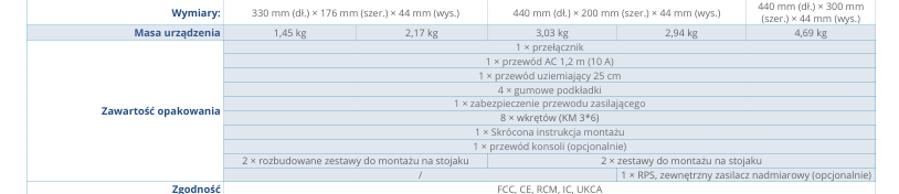 - PoE 802.3 af/at, do 30W na port, moc całkowita 240W