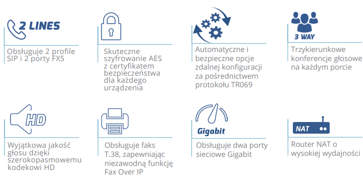 - Ta wydajna bramka VoIP charakteryzuje się wyjątkowo wysoką jakością dźwięku, wydajnym szyfrowaniem przy użyciu unikatowych dla każdego urządzenia certyfikatów bezpieczeństwa, funkcją automatycznej konfiguracji zdalnej umożliwiającą masowe wdrożenie i zarządzanie urządzeniami, a także wyjątkowo wydajnymi funkcjami sieciowymi do zastosowań w domu i w biurze.