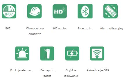 Słuchawka jest zintegrowana z alarmem wibracyjnym i Bluetooth. Użytkownik może cieszyć się rozmowami o wysokiej i stabilnej jakości dźwięku, nawet w miejscu pełnym szumów lub zakłóceń w sieciach bezprzewodowych. Nadaje się do użytkowania w środowisku, w którym może występować kurz, wilgoć oraz trudne warunki.